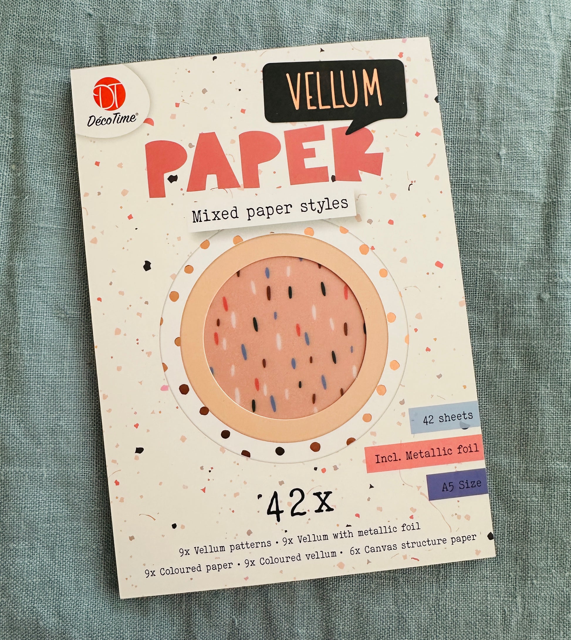 9 x vellum patterns, 9 x vellum with metallic foil, 9 x colored paper, 9 x colored vellum, 6 x cabvas structured paper