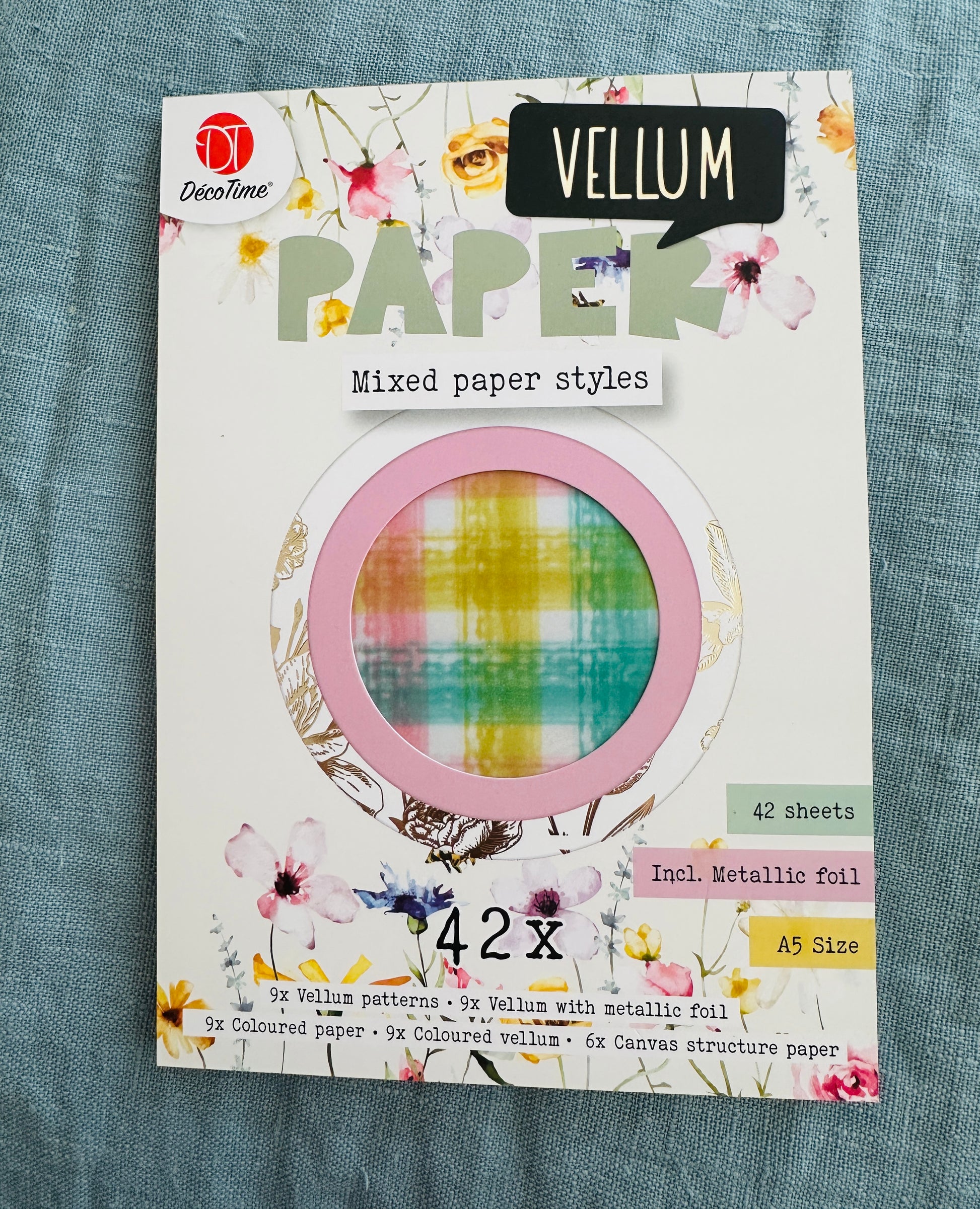 9 x vellum patterns, 9 x vellum with metallic foil, 9 x colored paper, 9 x colored vellum, 6 x cabvas structured paper